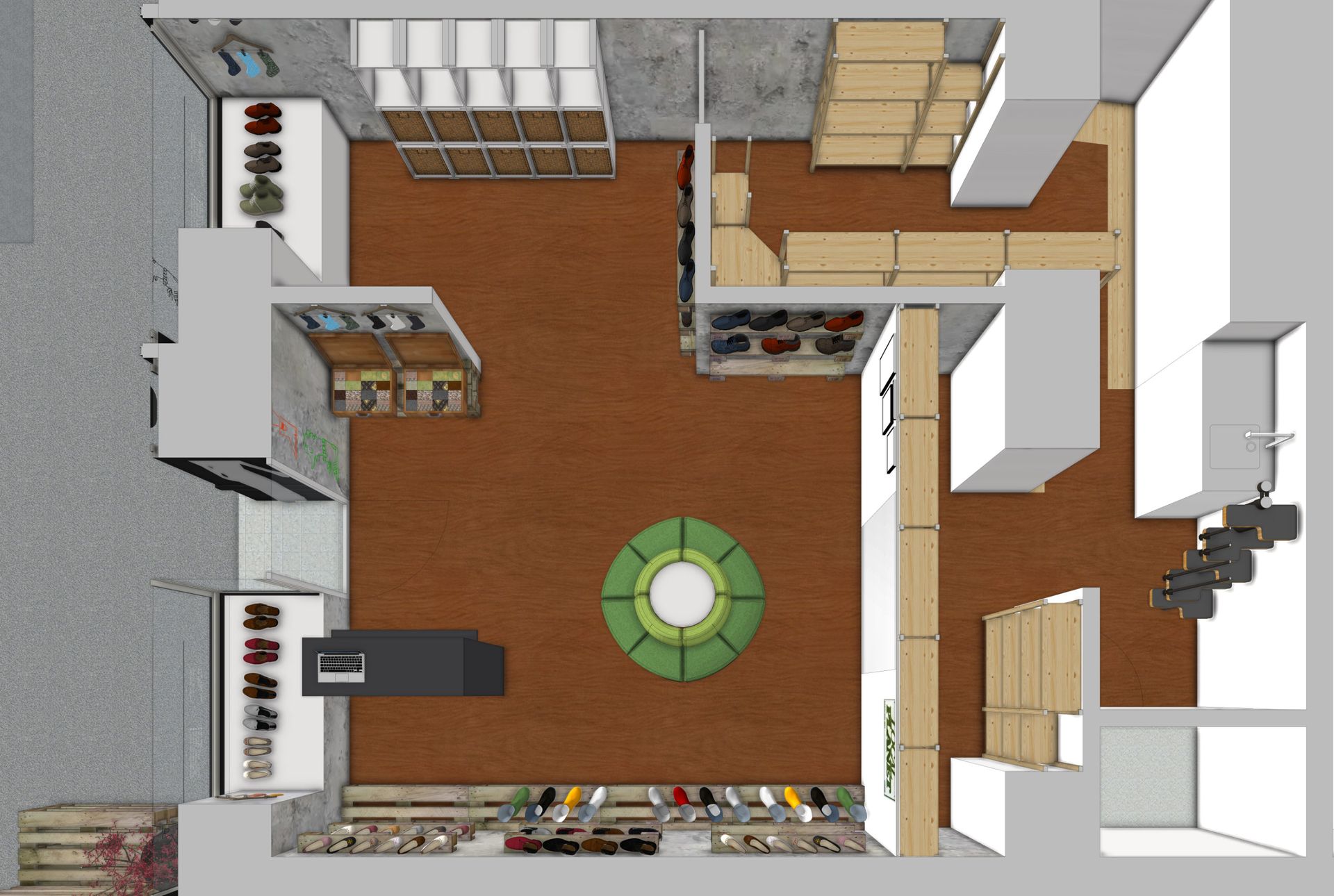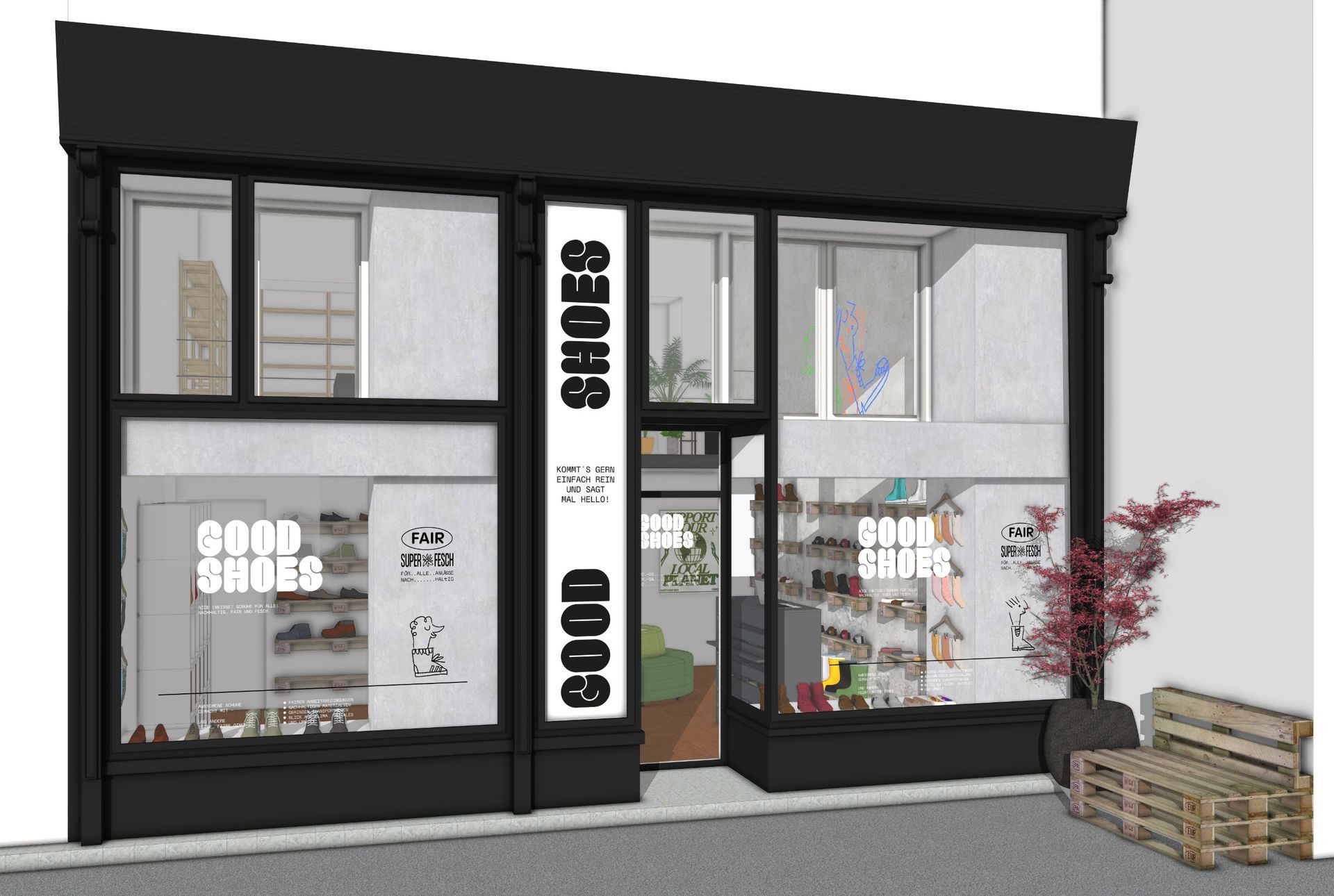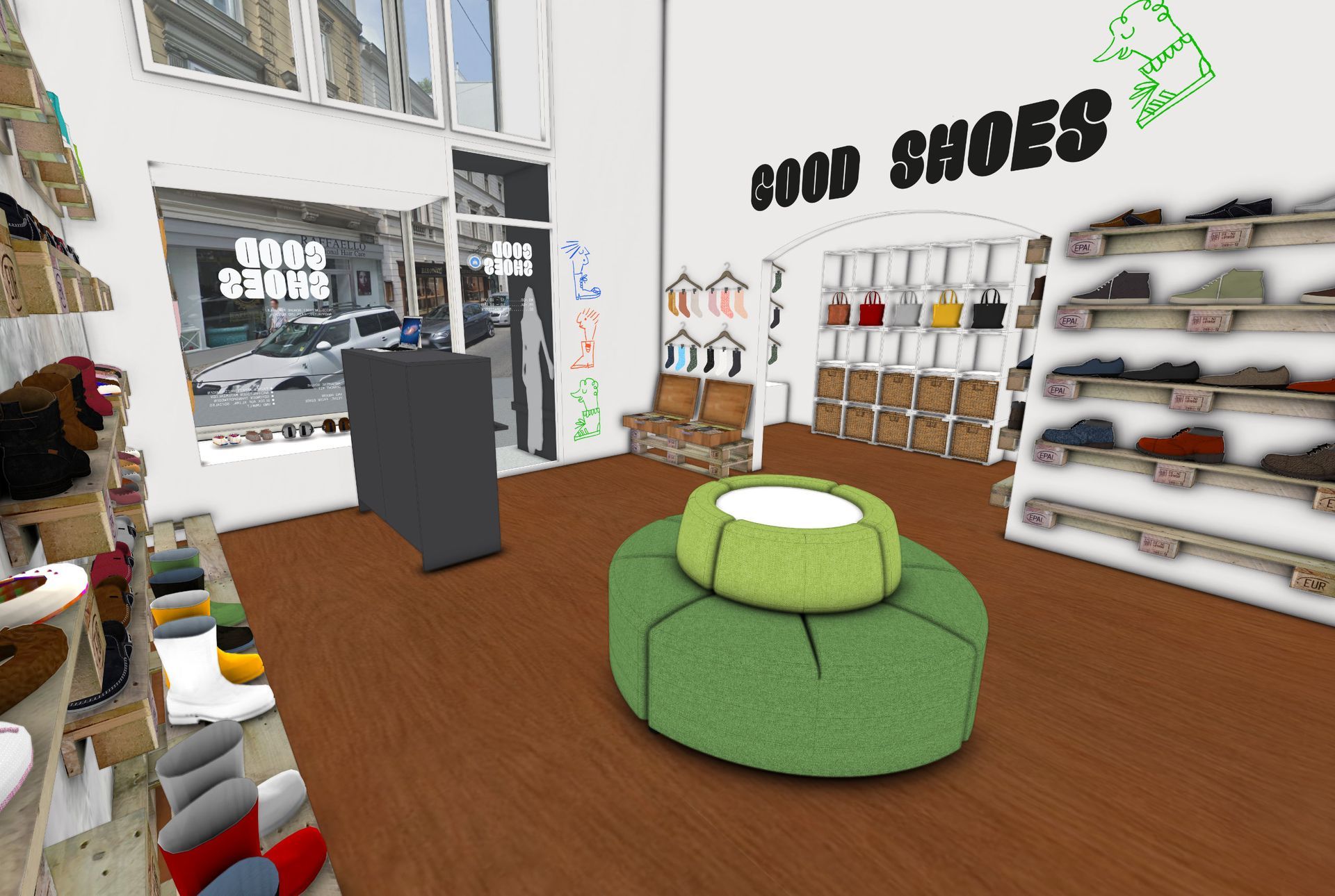 Das neu eingezogene Unternehmen GOODSHOES wollte sein Wiener Grätzel-Lokal im 9. Wiener Bezirk einladender und gemütlicher gestalten. Auf dem räumlich eingeschränkten Platz sollten ein Verkaufsraum, ein Lager und ein Büro entstehen.