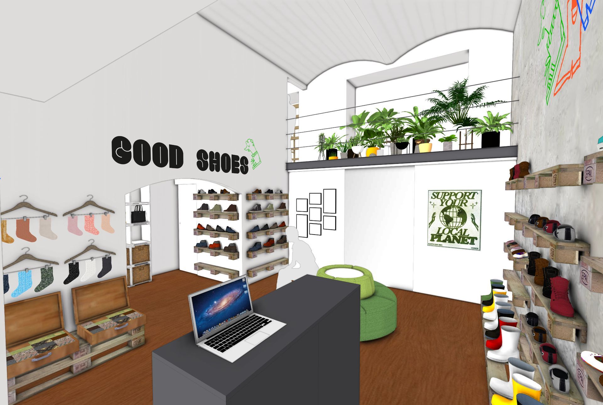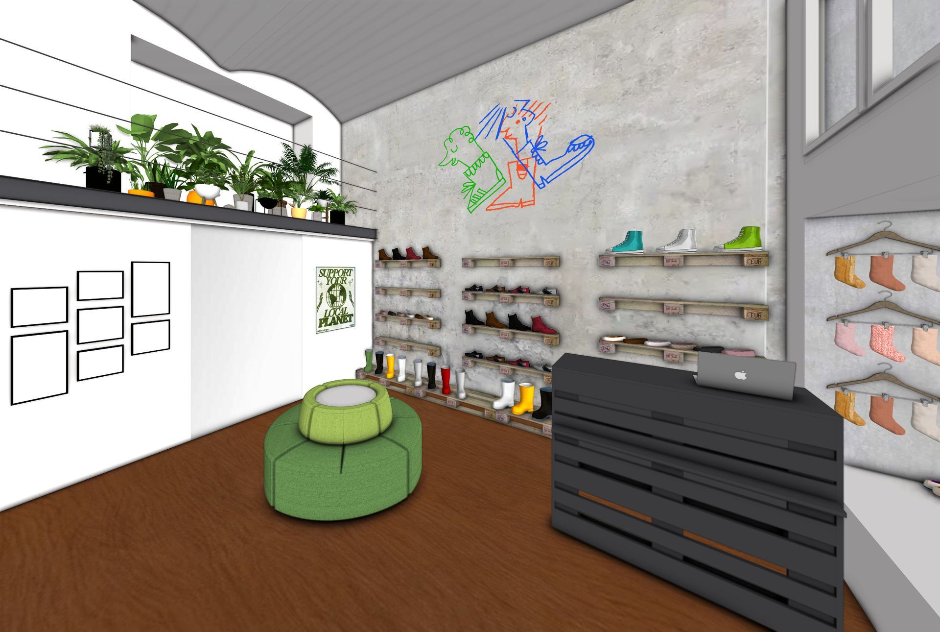 Eine Pflanzen-Galerie und große Spiegel vergrößern den Verkaufsraum optisch und verbergen gleichzeitig das Lager. Regale aus wiederverwendeten Paletten und ein zentrales, gemütliches Sitzelement betonen das nachhaltige Konzept des Unternehmens.